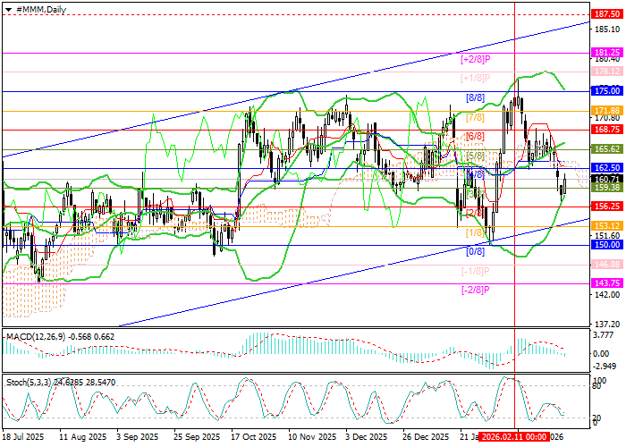 Stock quotes of the technology corporation 3M Co. are actively losing value, adjusting to the medium-term upward trend: the price has reversed from the upper boundary of the main Murray trading range at 175.00 (Murray level [8/8]), moved into its negative section, and is now testing the 159.38 level (Murray level [3/8]). Consolidation below this level would act as a catalyst for strengthening the downward trend toward 153.25 (Murray level [1/8], the lower boundary of the ascending channel) and 150.00 (Murray level [0/8]). The key for the “bulls” is the 165.62 level (Murray’s level [5/8]): a breakdown of this level and the middle line of the Bollinger Bands would allow quotes to test targets at 175.00 (Murray’s level [8/8]), 181.25 (Murray’s level [+2/8]), and 187.50 (Murray’s level [+2/8], W1).