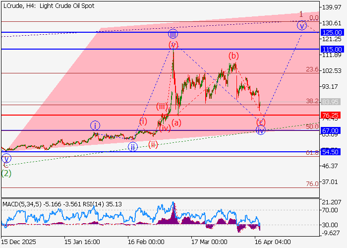 On the daily chart, the correction has concluded as the second wave of the higher-level (2), and the ascending third wave (3) is being formed, which incorporates the first wave of the lower-level 1 of (3). On the four-hour timeframe, the local corrective structure has been completed as wave iv of 1, with wave (c) of iv now approaching its final phase. If this scenario proves correct, the asset’s upward trend is expected to continue toward the 115.00–125.00 zone, with a critical stop loss level at 76.25.