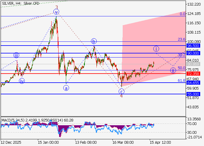 On the daily chart, an ascending wave 3 of senior degree has formed, with the correction having concluded as wave 4, while on the four-hour timeframe wave 5 is currently unfolding, incorporating the emerging wave i of 5 at junior degree. If this scenario proves correct, the XAG/USD pair’s upward trend is expected to continue toward the 90.00–96.50 zone, with a critical stop loss level at 72.35.