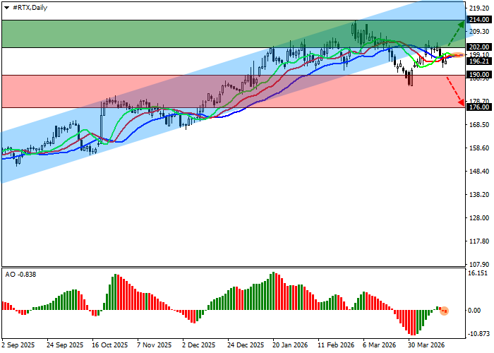 The shares of RTX Corp., an American aerospace and defense conglomerate, are trading at 196.00.